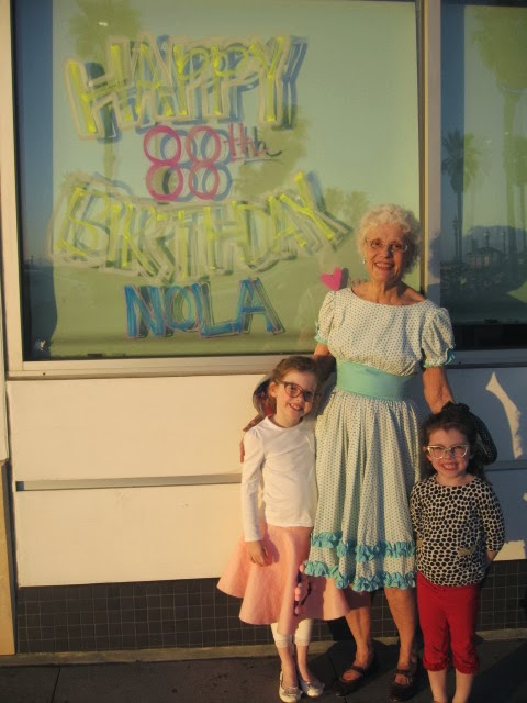 While in California we celebrated Nammy's 87th birthday by dressing up like we were living int he 50's and took her to Johnny Rockets for dinner. IT WAS SO MUCH FUN!!!! The girls all wore some of Nammy's actual glass frames that she kept from the 50's and 60's and we put on some fun clothes and her red lipstick and had a great time! It was so cute to see her enjoy being spoiled and sing along while we were all singing Happy Birthday to her. She is just the absolute coolest and I pray I'm half as amazing as she is at any time in my life let alone at the age of 87!!